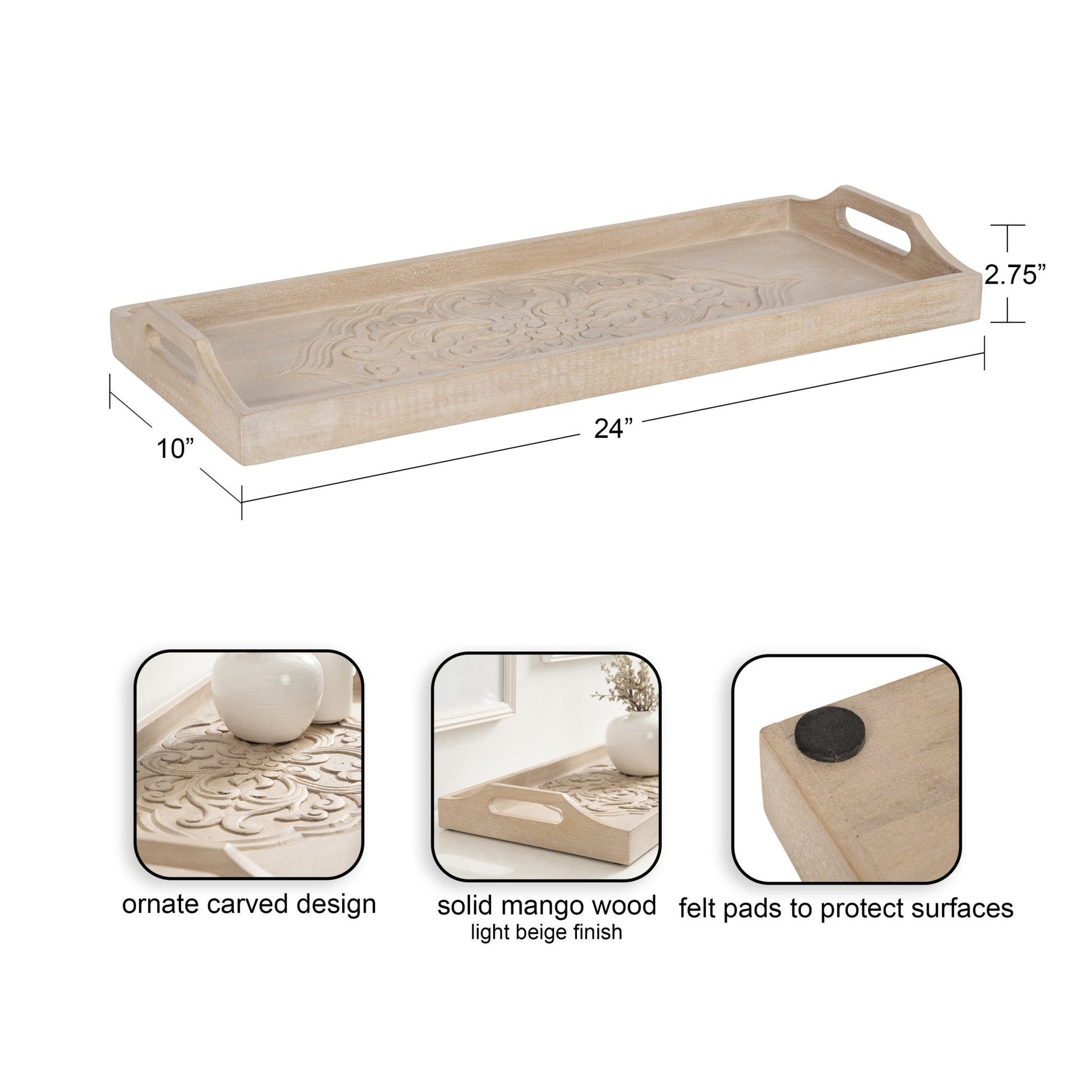 This Adhira decorative tray provides the perfect balance between solid mango wood and thoughtful ornate detailing. Utilize this versatile tray when showcasing your bright summer decor or your rustic fall decor accents without feeling out of place. The carved engravings jump off of the tray to provide texture and character for your space. Simple, stable handles provide an easy yet muted carrying method. Adequate storage and style do not have to be separate. You won't regret adding this stylish, hand-carved tray to any spot in the house.