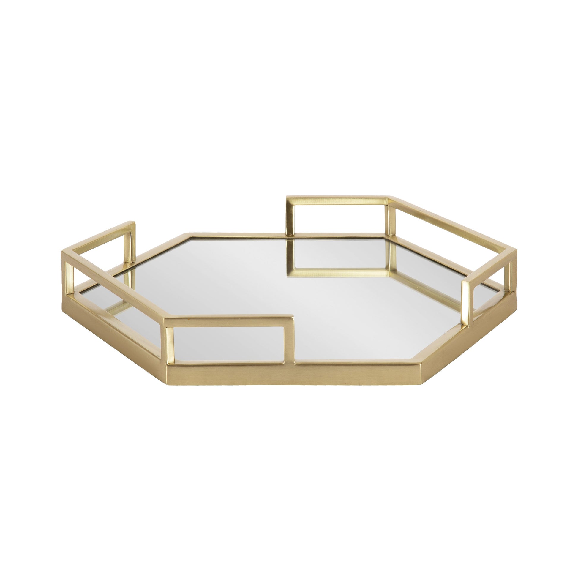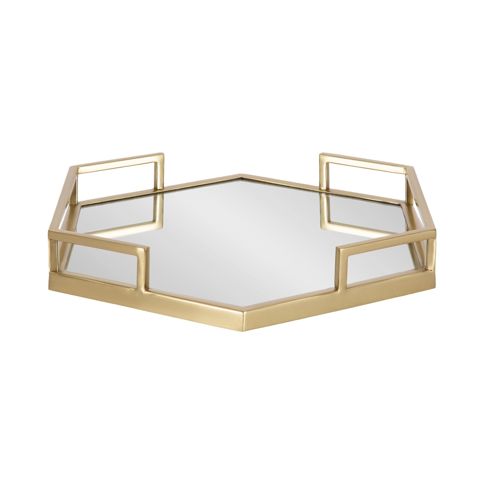 Bring contemporary glam style into your home with this charming hexagon accent tray with metal handles. Place this geometric mirrored tray on your entrance console table as a catchall tray to hold your keys and change as you come and go. This glam tray can also be used as a decorative accent on an ottoman to hold your beverages or on your vanity for makeup organization. The tray has a soft felt bottom to protect your hard surfaces from scuffs. An update to the classic accent tray, the base has substantial handles that help to keep your items more secure when transporting them. From a dining room table to a living room ottoman, this geometric tray brings tremendous versatility anywhere throughout your home. Its skinny size makes it great for serving snacks on little plates or as a decorative display option.