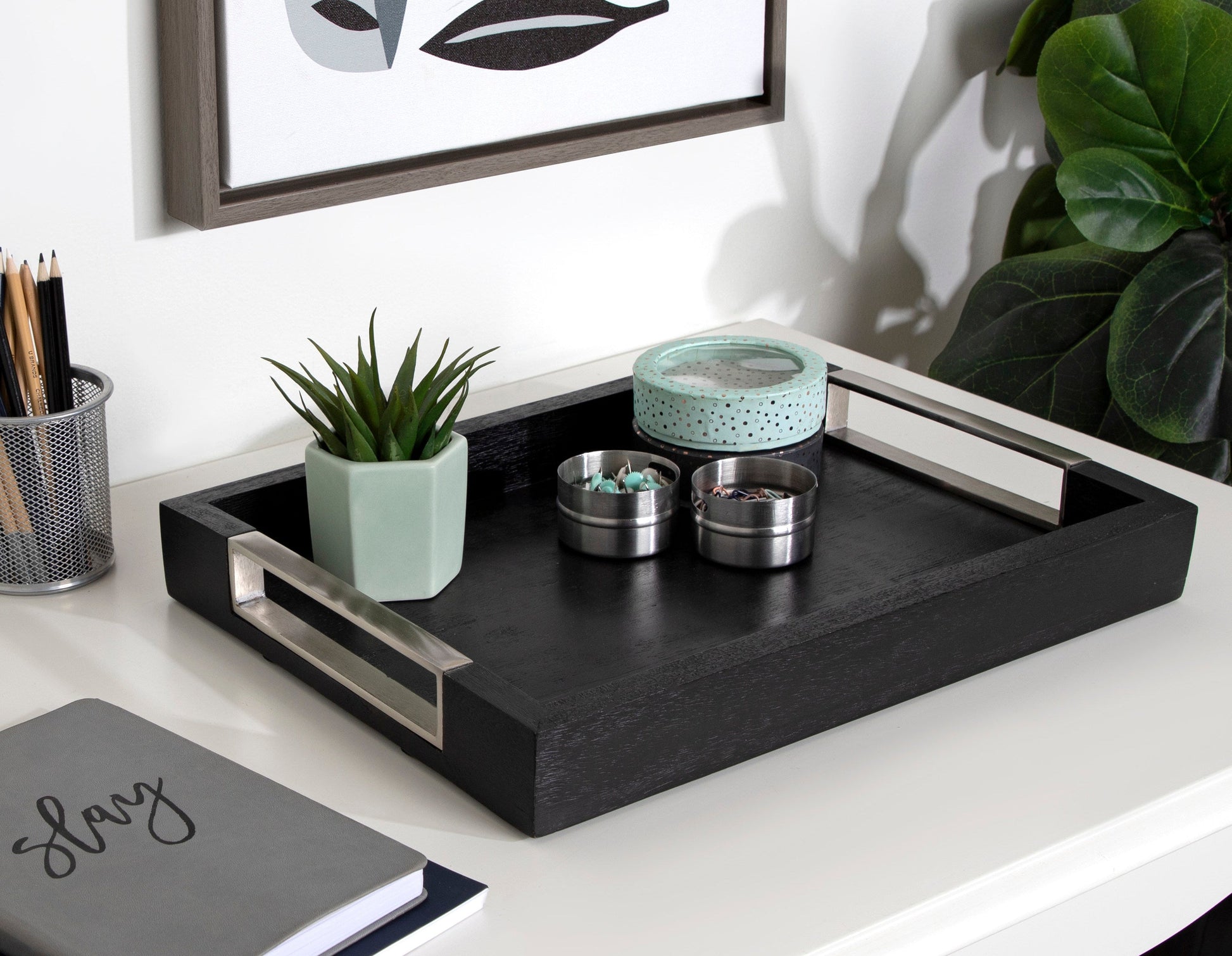 Layer your decor with the multifunctional and sophisticated Heller tray. This beautiful tray was crafted in India out of solid mango wood, with two iron metal handles. It's a fantastic way to serve cocktails, display decorative keepsakes, or store media remotes for your next movie night. The Heller tray is fantastic for layering your decor on your ottoman, console table, coffee table, or bed. It's the perfect accent piece for bringing your decor together while showcasing your modern decor taste.